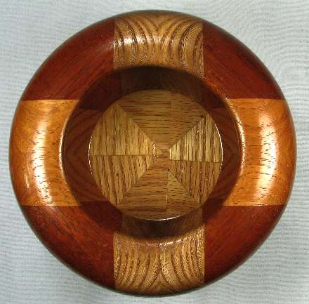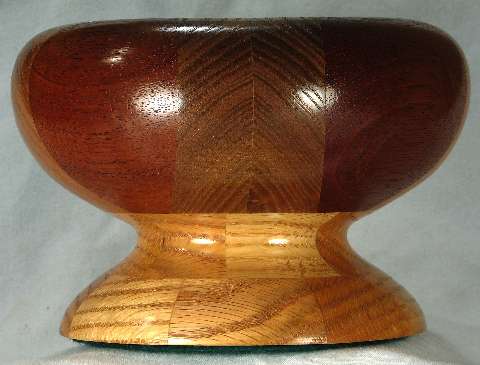 comments: This was one of my earliest bowls and was an experiment in end-grain turning and was finished before I started using poly with a UV blocker. I think it turned out really well, except for the slight "muddying" of the end grain lines by the polyurethane, which I did not expect. It sat on a shelf for years with no UV blocker and the woods have darkened from their original color, as you can see in the pics below.