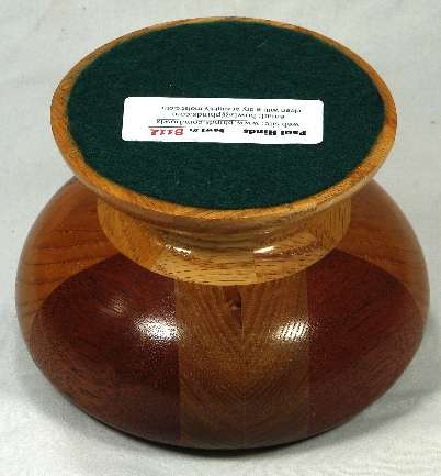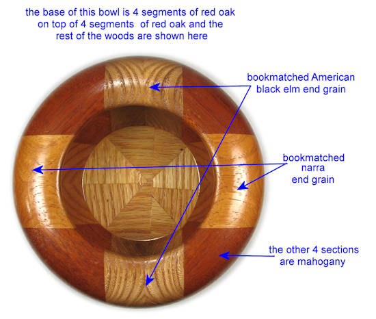 (1) just off the lathe --- notice how the elm end grain is more sharply defined than it becomes after the application of the polyurethane. The same happened with the narra end grain. It is unusual that applying a finishing agent "muddies" the colors/grains; usually it sharpens them, as you can see it has done with the oak base.