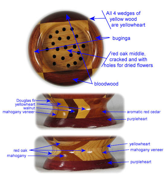 The low price on this one is mostly because of the flaws, not because I don't like it --- I think the subtle differences between the two reds of the major woods (bubinga and bloodwood) worked out the way I had hoped it would.