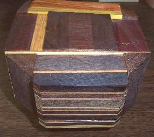 view 1: lamination of mahogany veneer, hard maple veneer, walnut veneer, hard maple veneer, padauk, hard maple veneer, walnut veneer, hard maple veneer, mahogany veneer, walnut, mahogany veneer, hard maple veneer, walnut veneer, hard maple veneer, mahogany veneer, ash thin, walnut(?), hard maple veneer, mahogany veneer, unknown dark wood, and all of that backed by cherry thin, mahogany veneer, walnut and the corner wedges are also walnut, then all of that backed by hard maple veneer, thick mahogany veneer, hard maple veneer. WHEW !!!