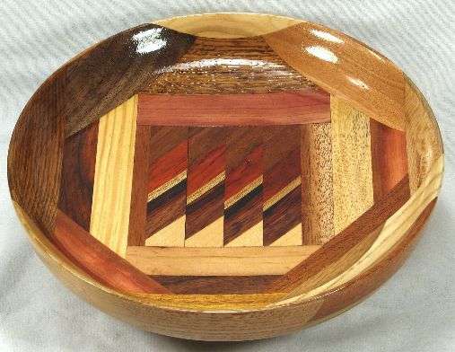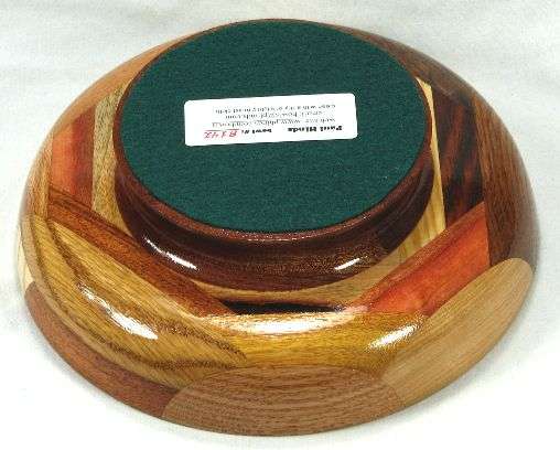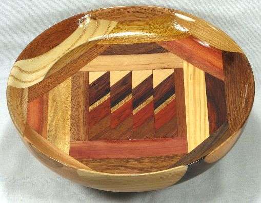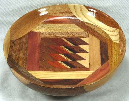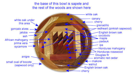 LATER: the redheart pieces in this bowl have faded to light tan but the bowl is still basically what you see is what you get. BUT ... there is a stress separation between the canary and the granadillo at the top that you don't see but that you certainly can feel. This one is minor but still, I hate those separations, so I have dropped the price to $75.