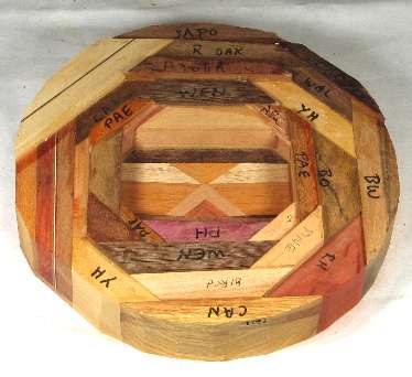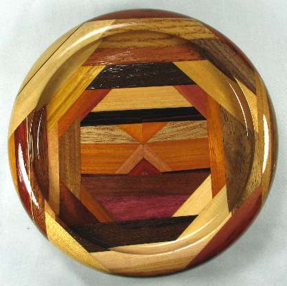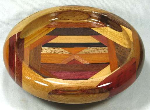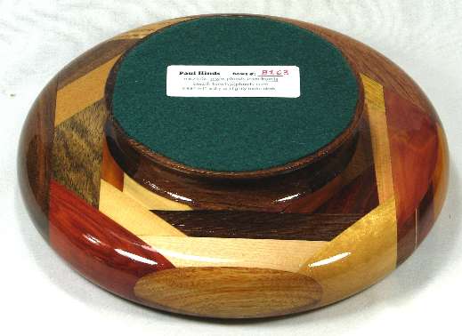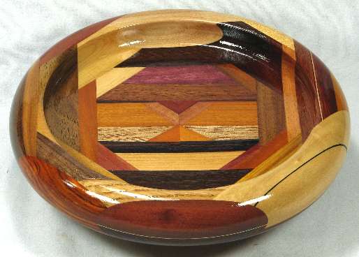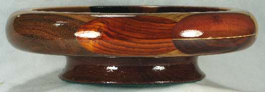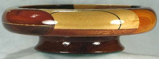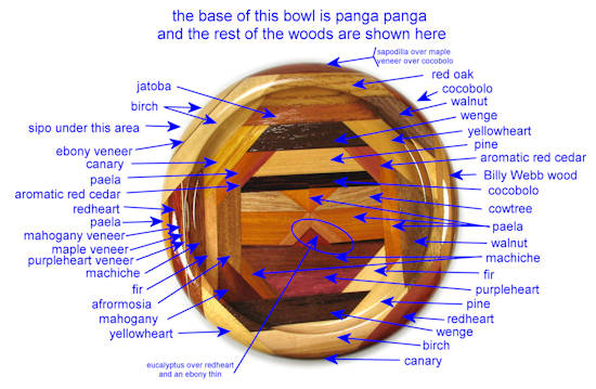 comments: the purpleheart at the bottom of the middle area is nicely chatoyant, and covered in ray flakes. The bocote at the right side is a poor sample of that species. The redheart and paela throughout this bowl are nice, and the billy Webb wood in on the right is an excellent piece. The sapodilla at the top exhibited the "rare steak" coloration but it has now darkened to sold red-brown. The canary at the upper left is an unusually bright yellow. The base is a particularly light-colored piece of panga panga.