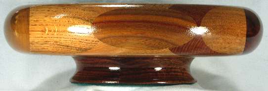 comments: I really like the way the ebony veneer in the box sets off the other woods. The oval of canary at the top on the outside of the rim has nice red streaks and the imbuia sapwood on the right side rim has a very attractive grain pattern. Several of the woods in this one are nicely chatoyant including the imbuia on the right side rim, the shedua at the bottom, the canary on the outside of the top rim, the chechem in the lower right and both the osage orange and the bubinga in the lower left and several others.