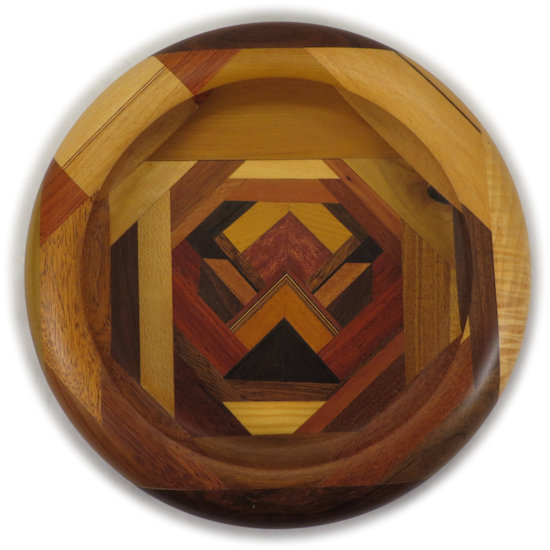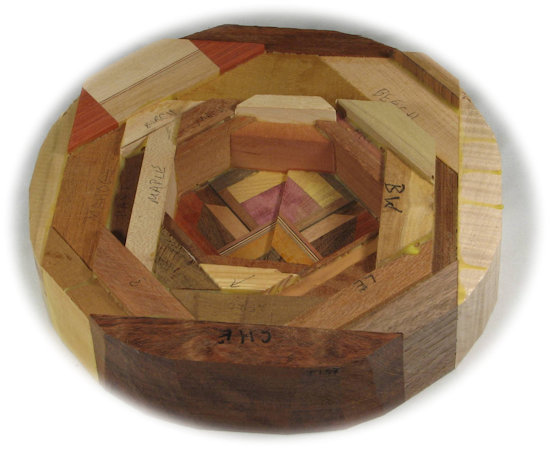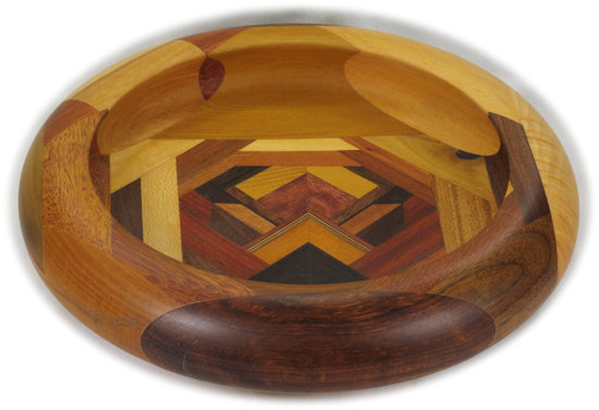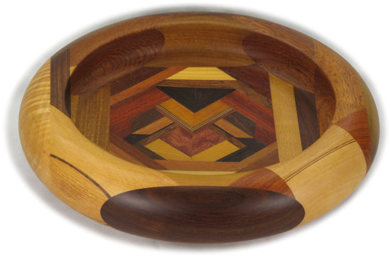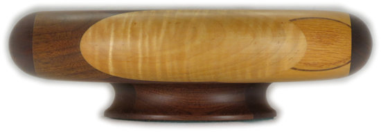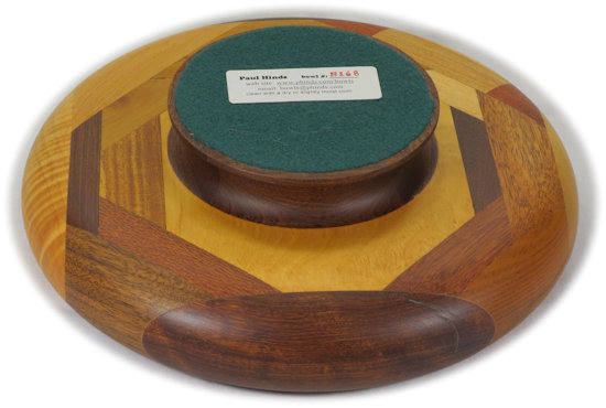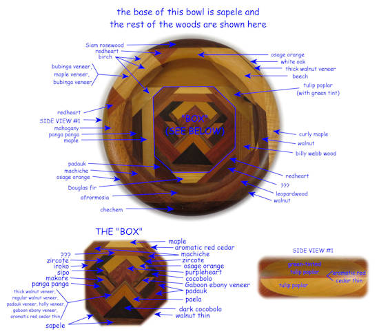 I ALWAYS POINT OUT ANYTHING THAT NEEDS TO BE COMMENTED ON. THESE ARE (UNLESS OTHERWISE STATED) THINGS THAT DO NOT DETRACT FROM THE BEAUTY OF THE BOWL, BUT I WANT TO BE SURE I GIVE A COMPLETE DESCRIPTION. SO ... The chechem on the lower rim has a pair of adjacent cracks on the lower left side. The larger of them is obvious to the touch. This is not a stress fracture, it is an internal flaw in the wood --- it just happens sometimes since wood is an organic material and this piece of chechem is so spectacular that I would have used it even if I had known in advance that the cracks were there. The osage orange in the lower left also has a significant crack of the same kind. Again, these are wood characteristics, but still, I've dropped the price from $150 to $125 because of them.