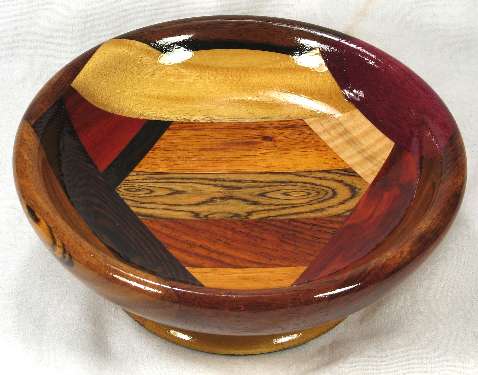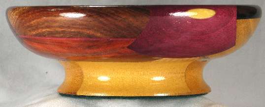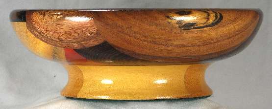 flaws/issues: The glue line between the canary and the bocote in the middle has a gap that shows on the surface. I can see it in the high-resolution large image of the bowl blank so I know it's not a stress separation, but I don't know how I ever allowed it to happen in the first place.
