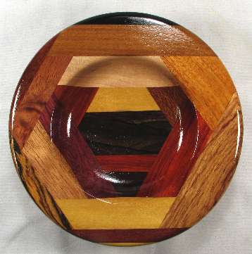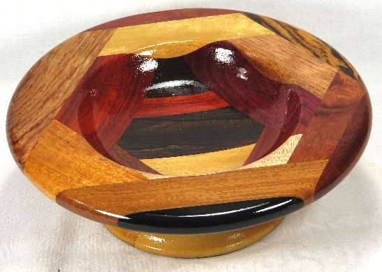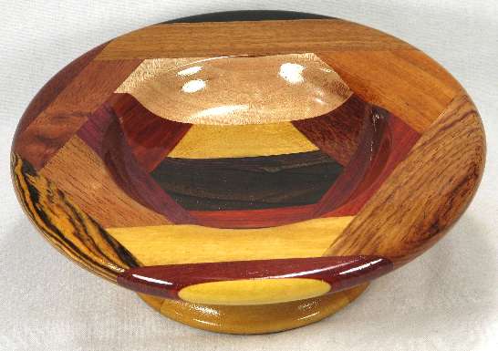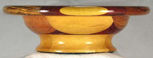comments: Very nice woods throughout this one including several that are at least lightly chatoyant. I'm very pleased with the choice of yellowheart for the base on this one as it gives a nice light appearance to this bowl, aided somewhat by the small size, plus this particular cut of yellowheart is nicely chatoyant