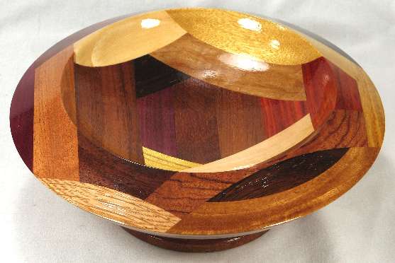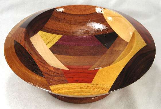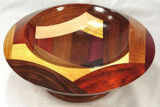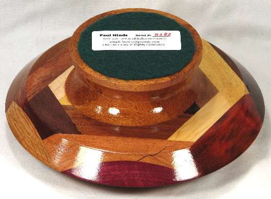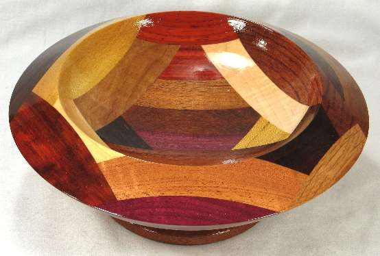 comments: Really nice curvature of the inside --- sort of makes the top portion of the bowl look like the top of an inactive volcano. The redheart in view 8 has a nice variety of red shades and the wamara in view 6 is a very rich shade of brown. LATER: that redheart piece has darkened noticeably since these pics were taken many years ago.