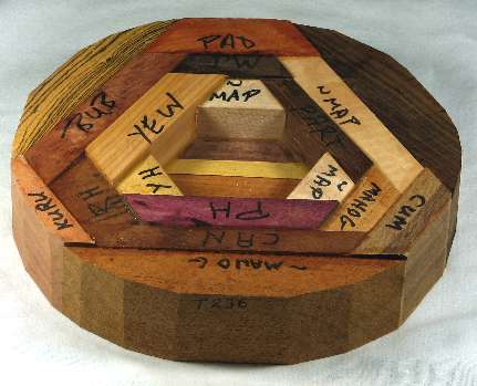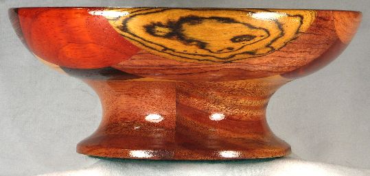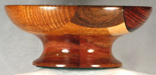 comments: The cocobolo at the bottom is a very nice piece, as is the bocote in the upper left. The mahogany in the base is unusually well-figured. Nice woods throughout --- not a single disappointment in this one although the curly mahogany at the bottom looks better from the bottom than from the top and I wish it were the other way around.