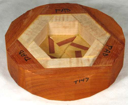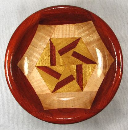 all of the red wood around the outside is padauk and all of the off-white wood inside the padauk is curly maple. In the middle (the BOX) is all yellowheart with darts of redheart