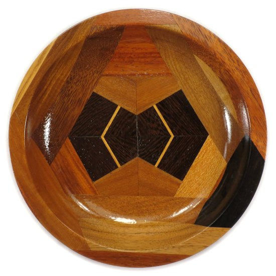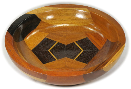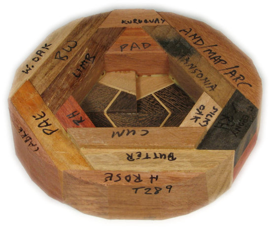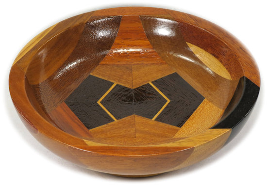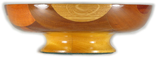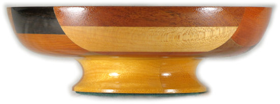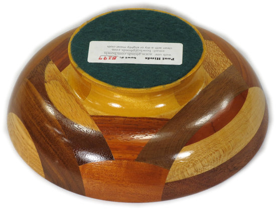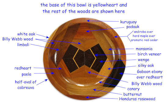 COMMENTS: The grain of the wenge in the middle is quite nice although it's so dark that it's hard to see the grain lines. The billy webb wood in the upper left is nicely chatoyant and the butternut in view 1 is lightly chatoyant. Nice simple bowl shape on this one.