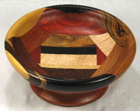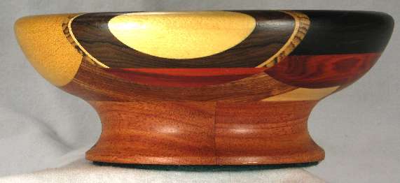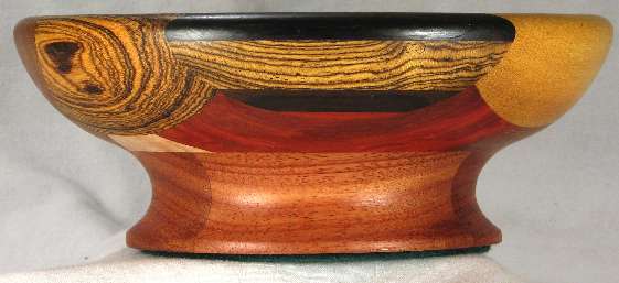BOX: from the bottom up; bocote, African blackwood, curly maple, yellowheart, panga panga. On both sides are wedeges of redheart.