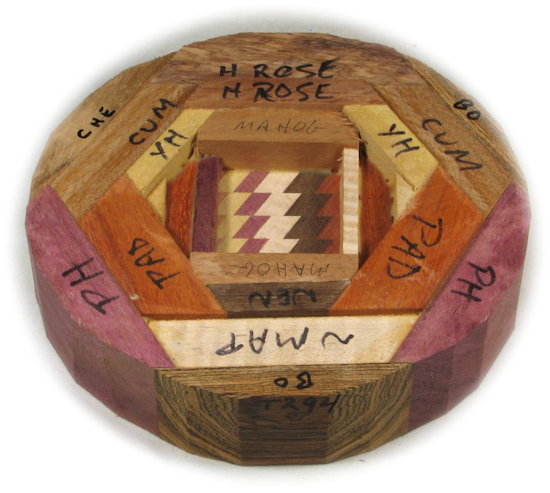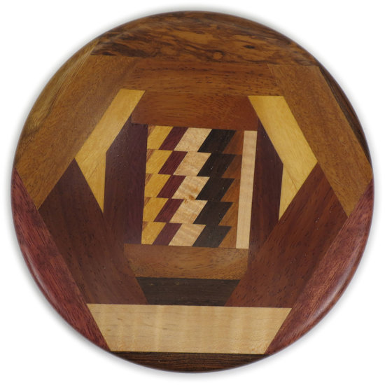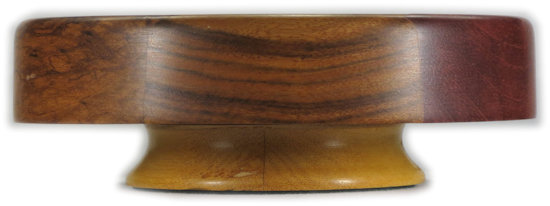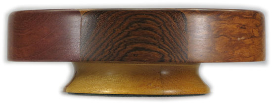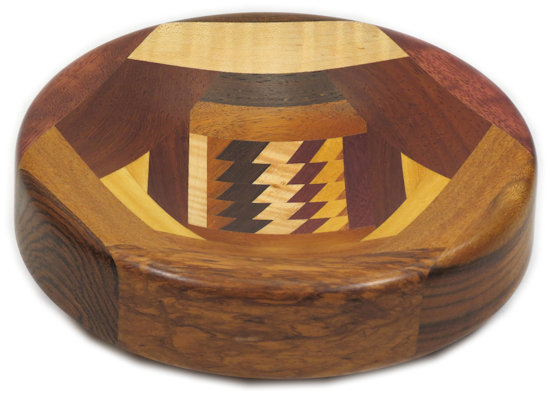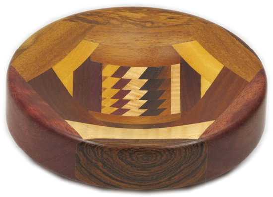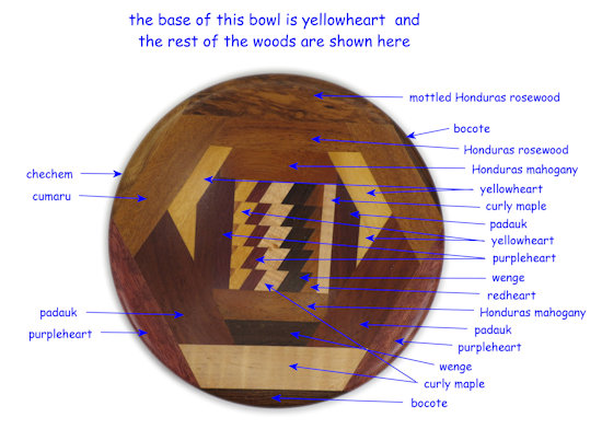 The purpleheart in the lower left and lower right are both nicely chatoyant as is the chechem in the upper left (although this piece is extremely muted from what it would be if this bowl had a high-gloss finish) and the yellowheart in the lower right and upper left. The Honduras rosewood at the top is a fabulous piece, with a highly mottled grain. "Mottled" in this context is more in the sense in which it is normally used in English, not as it is normally used in wood descriptions. It is also lightly chatoyant
