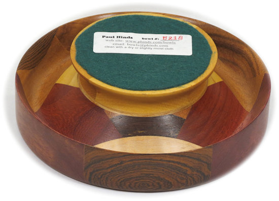 I ALWAYS POINT OUT ANYTHING THAT NEEDS TO BE COMMENTED ON. THESE ARE (UNLESS OTHERWISE STATED) THINGS THAT DO NOT DETRACT FROM THE BEAUTY OF THE BOWL, BUT I WANT TO BE SURE I GIVE A COMPLETE DESCRIPTION. SO ... The vertical purpleheart in the left side of the the middle has a slight chip-out on its upper edge. This started when the surface had not been turned down nearly all the way and I thought it would turn off but it never did, it just kept chipping out. I took off the last 1/64th of an inch with sandpaper but even that did not totally remove the tiny remaining chip-out. Subsequently that same area developed a small stress separation which makes the area even rougher to the touch but still not especially visible. This has caused me to reduce the price somewhat.
