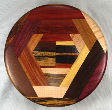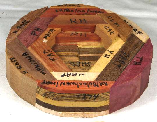 LATER: The bocote and the yellowheart, both at the bottom, have darkened since these pics were taken many years ago and the purpleheart at the lower right is still purple but not as vibrant as it was originally. Because of the color darkening, and the poor surface in the middle, I have reduced the price from $110 to $85
