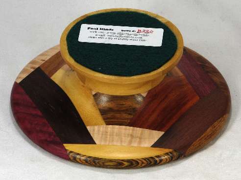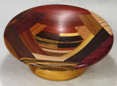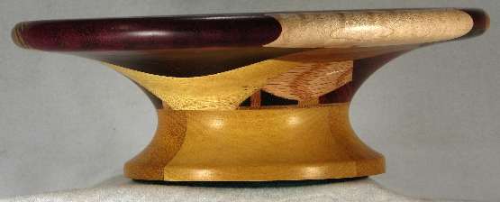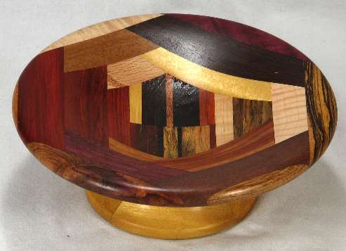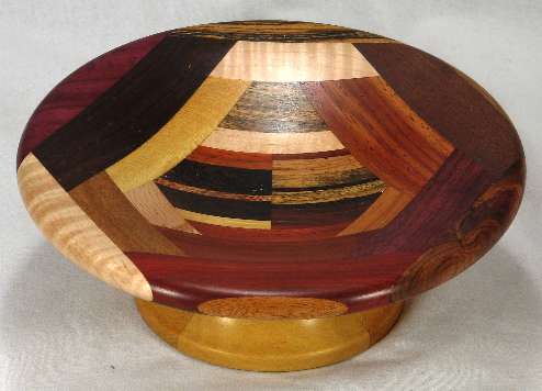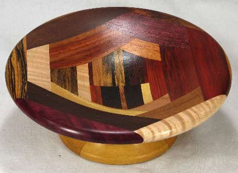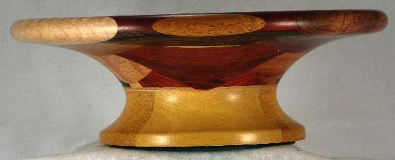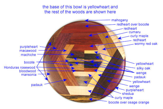 comments: The Honduras rosewood at the upper left is particularly nice (a crotch area). The bocote under the rim at the top is exceptionally dark --- looks more like wenge than bocote, but it definitely is bocote. The purpleheart at the lower right is an especially deep rich purple: contrast it with the purpleheart in the upper left. I don't know if the piece in the upper left was baked but the one in view 2 definitely was and it was one of those pieces where baking it really deepens the purple. (See my wood ID web site's purpleheart page for "baking purpleheart")