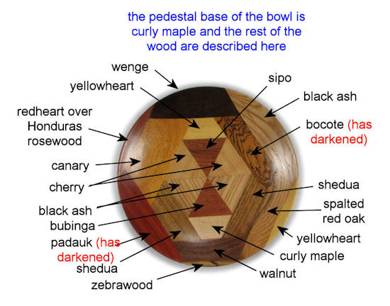 LATER: the canary in the upper left and the yellowheart at the top middle have both gotten darker since these pics were taken many years ago. The video is recent and shows the colors correctly