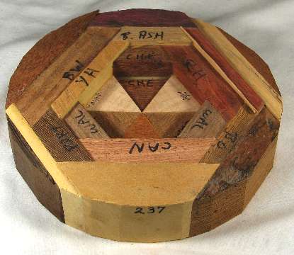 comments: The inner surface of the yellowheart in view 1 and the outer surface of the leopardwood in view 6 both have very nice ray flakes. The billy webb wood in view 6 is nicely chatoyant as is the flaky inner surface of the yellowheart in view 1