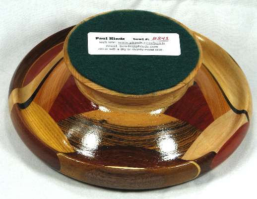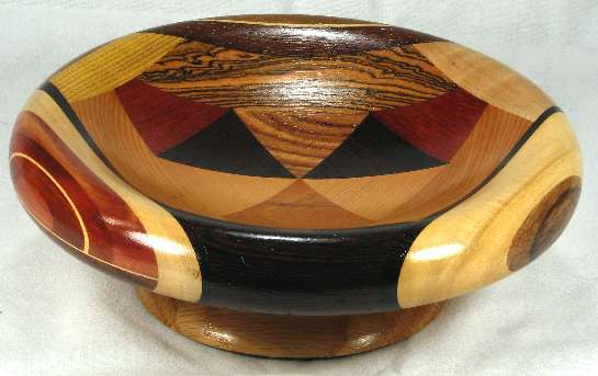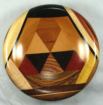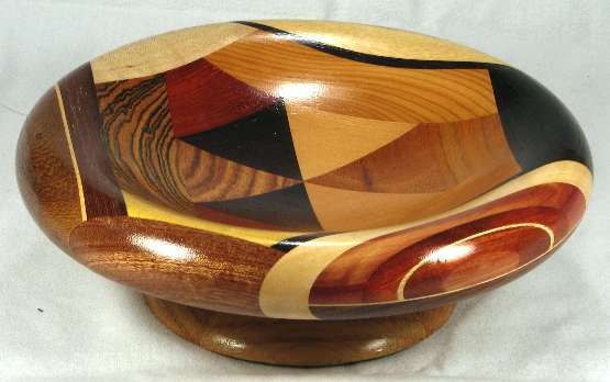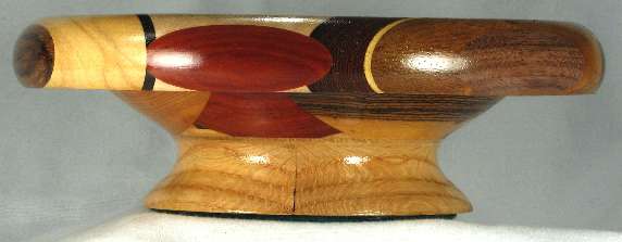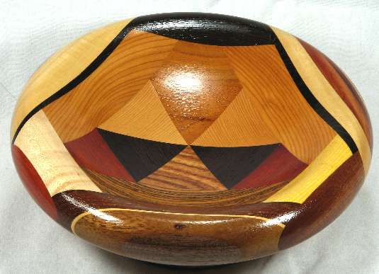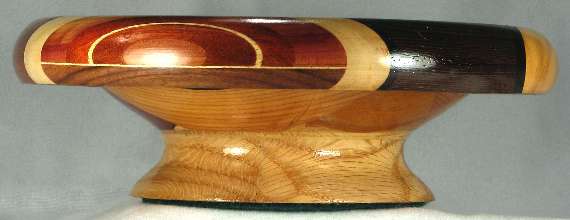 comments: Excellently contrasting woods in this one and a very graceful curve to the undercut rim. The inner surface is a smooth continuous curve, somewhat like my "wok" bowls.
