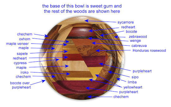 comments: The chechem at the bottom and upper left are both nicely chatoyant as is the zebrawood in the upper right. The limba in the lower left is mostly dark "black limba" but has an interestingly-grained slice of "white limba" sapwood at the outer rim as you can see in the 4th pic below. The purpleheart in at the bottom is a particularly rich color.