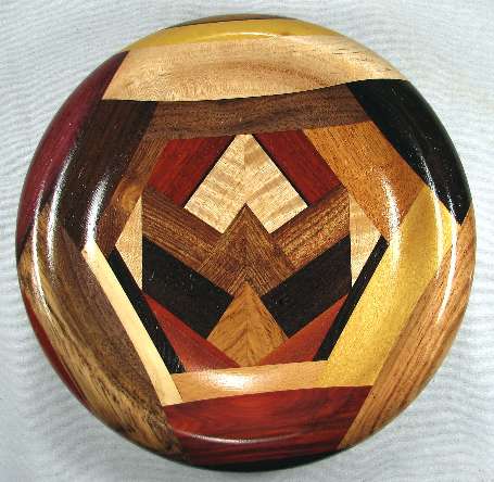 BOX: pairs from the bottom up; redheart, narra, wenge, chechem sided by chechem, curly maple sided by ebony veneer then padauk. Outer wedges on left and right are maple.