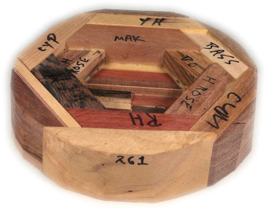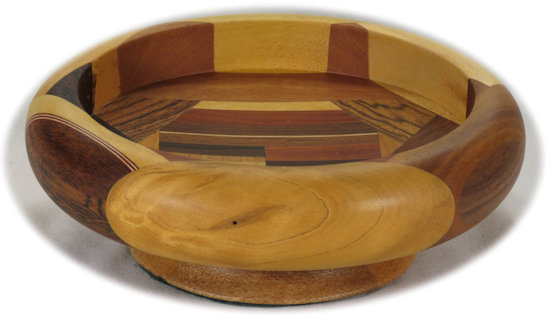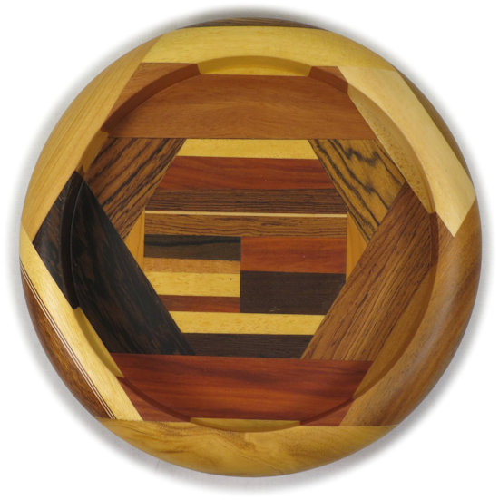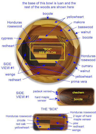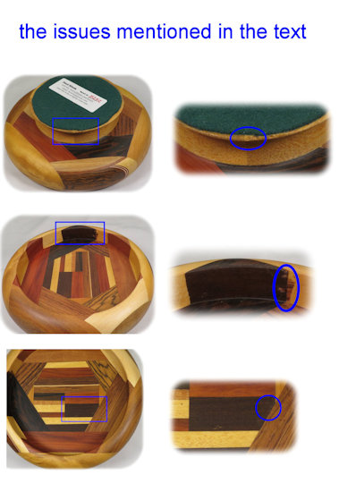 There are a couple of extremely minor rough spots where woods join. There is a tiny chip-out in the middle lower right in the upper right corner of the wenge. There is some very minor chip-out on the bottom edge of the base but it IS noticeable if you are examining the base up close. The only really significant issue is that there is an area of chip-out in the inside of the rim at the upper left where the edge of the wenge meets the cypress. and a sliver of zebrawood shows through. Because of all these issues, I've priced this one quite low.