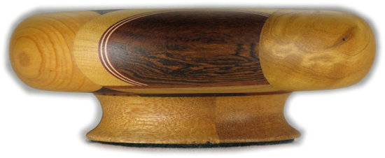 The yellowheart at the bottom is really gorgeous and is very chatoyant even though the flat finish mutes that somewhat. It has an ambrosia bug hole in it with a very small mild stain radiating from it left and right but this is character, not a flaw. Also, yellowheart is normally fairly bland as far as grain goes but this piece has a nice swirly grain (it was likely at or near a crotch). The bocote oval on the top outside rim stands out nicely because of the yellowheart behind it.