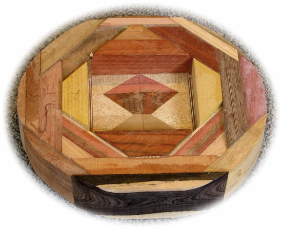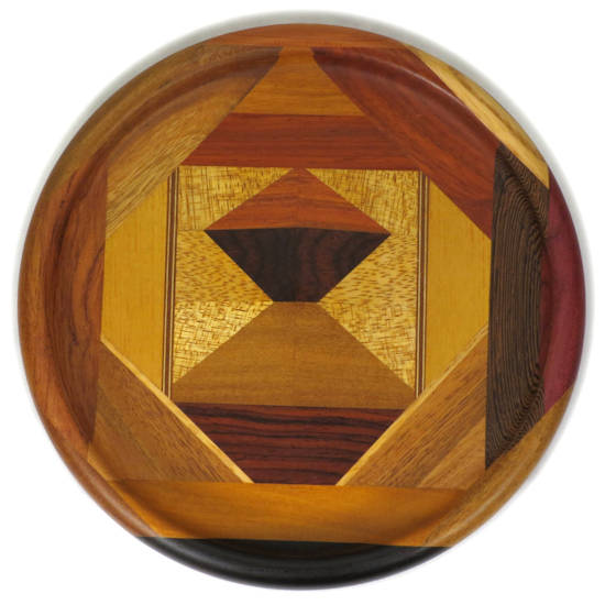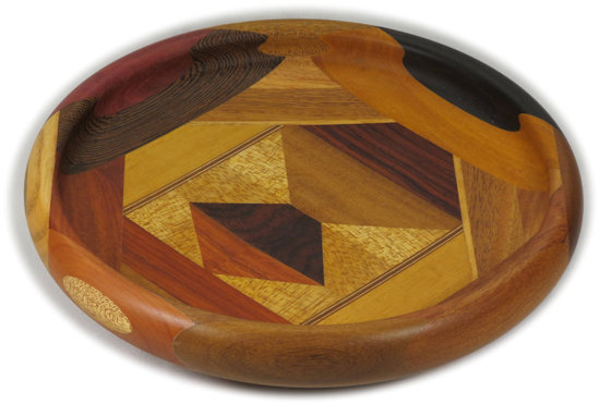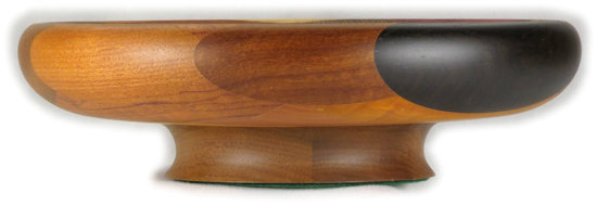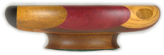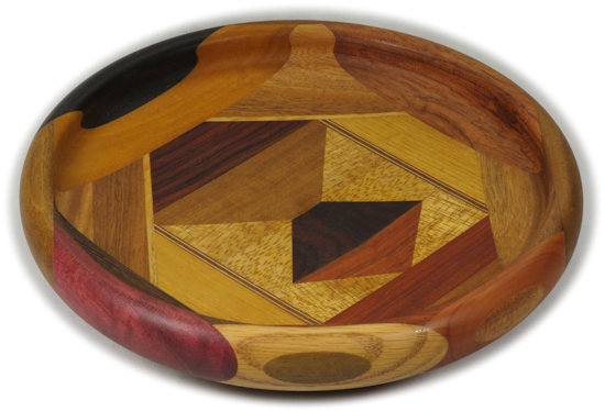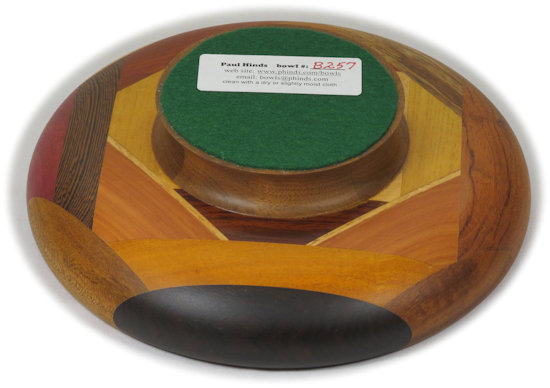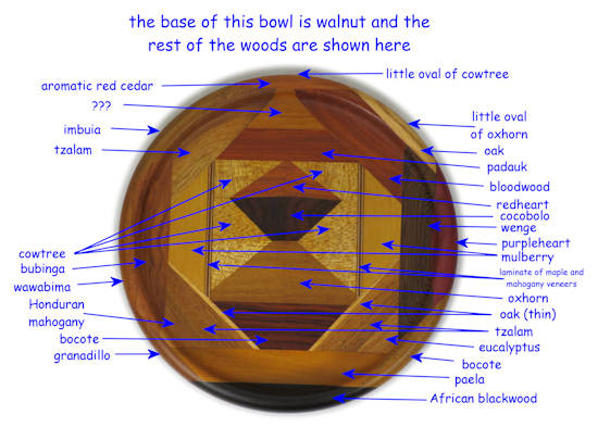 finish: one coat of natural stain then 3 coats of semi-gloss polyurethane (with UV blocker) then 10 thin coats of dewaxed shellac topped by 2 coats of clear flat enamel to take the shine off. Note that this enamel finish sometimes (including this bowl) has a weird effect on the pics without having a similar effect on the actual bowl. What happens is that the yellow woods become noticeably more yellow (again, in the pics, not on the bowl itself) and white woods take on a yellow tint. If I color-correct the white/yellow, then the reds and purples come out very wrong, so I leave the pics the way they are, but be aware that yellows in particular are slightly more yellow in the pics than in reality.