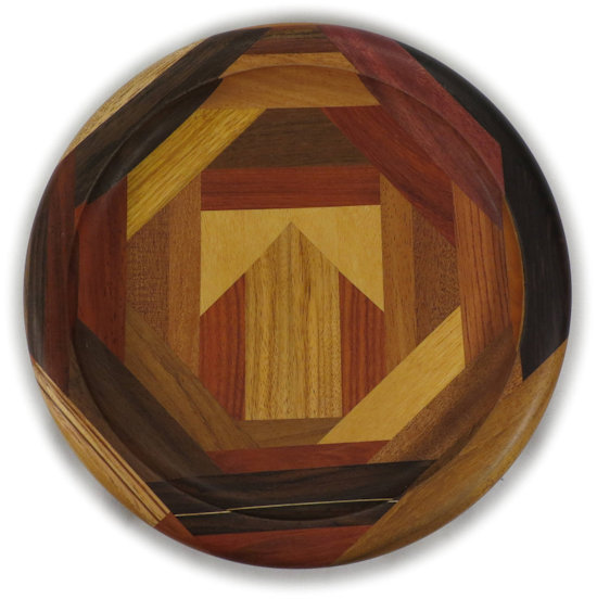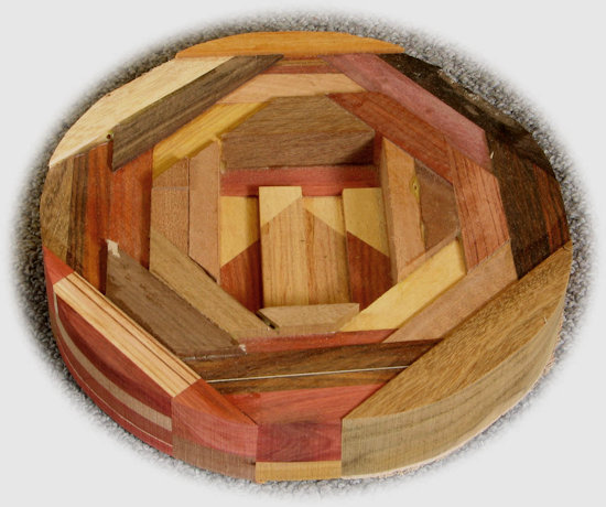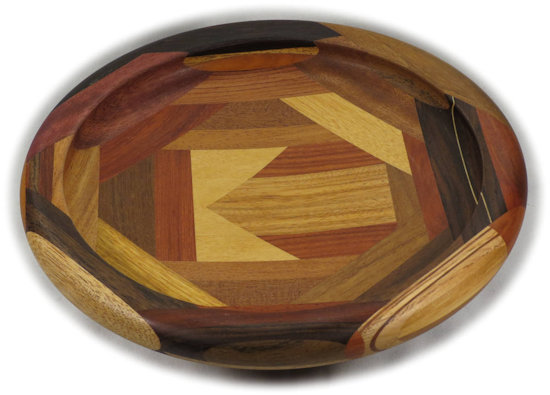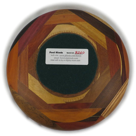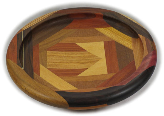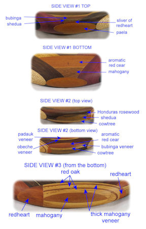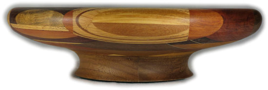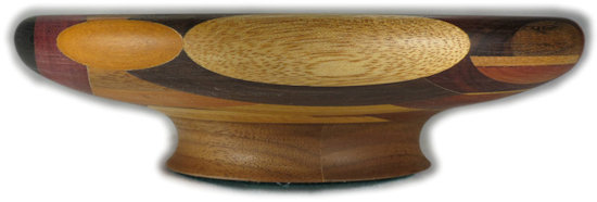 COMMENTS: This one's a bit "busy" around the rim but it's got some very attractive woods, nicely contrasting. The "omega curve" inside the rim on bottom is particularly nice, with the light colored veneer sandwiched between two dark pieces. The middle part of the bowl worked out quite well with the contrasting red and yellow colors.