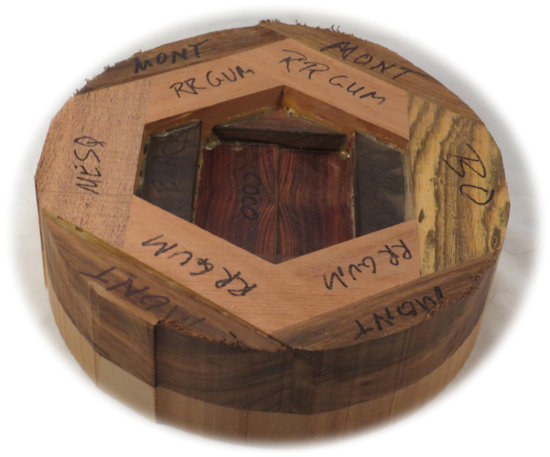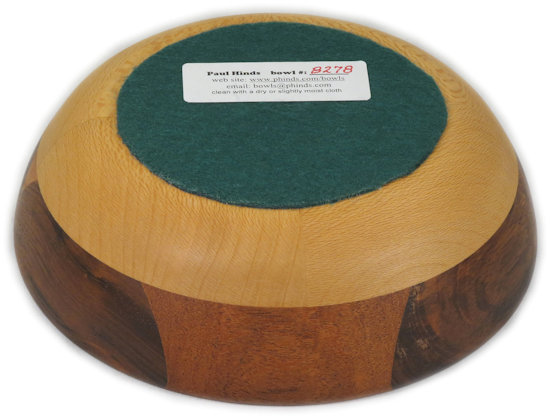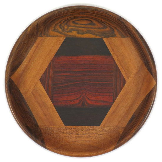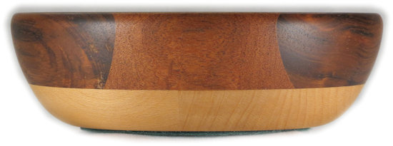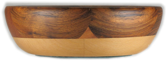 COMMENTS: This bowl sat around my basement for years before I finished putting on the finishing agents and in that time most of the woods darkened a fair amount and I find somewhat to my surprise that I really like the result. The most important things are that the cocobolo in the middle is still beautiful and the grain pattern in the bocote at the top is quite visible. The base is unlike any I've ever done before. Rather than my normal "pedestal base", this one is segmented sycamore that was as wide as the bottom of the blank and was turned to have a continuous curve with the rim of the upper part. I have mixed feelings about how this looks but it does give the bowl some extra heft and certainly adds stability.