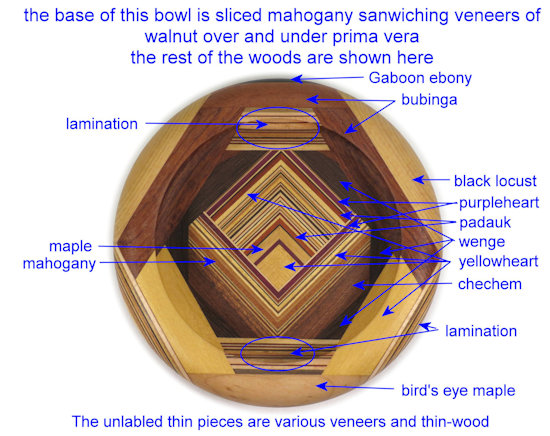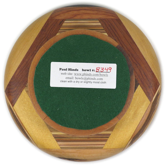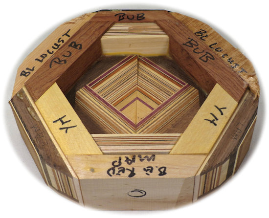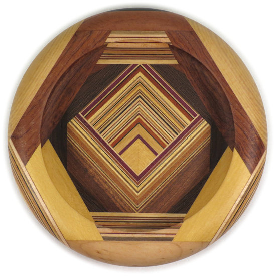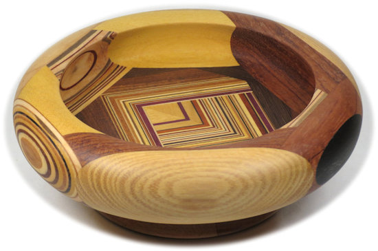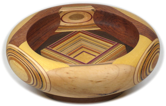 COMMENTS: A small but busy bowl with a lot of laminations that came out just the way I wanted them to except for a minor lack of symmetry between the right outside and the left outside. The black locust pieces at the top left and top right are quite chatoyant although that is somewhat muted by the flat finish.