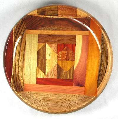 BOX: on the bottom is aromatic red cedar and on the top is Honduras rosewood. On the left side is tulip poplar and on the right side is aromatic red cedar with sapwood. In the middle are 4 vertical sections of wedges as follows from the left to right: (1) ? (brown wedges) with canary above and below, (2) prima vera with sapele above and below, (3) padauk over ? over mahogany over ? (shedua?), (4) same as (3) but mirrored.