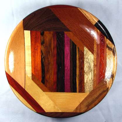 BOX: the slants in the upper right and lower left are ? (probably mahogany). From the left: ? (reddish brown), bocote, purpleheart, wenge, redheart, ? (probably tzalam), bocote, padauk