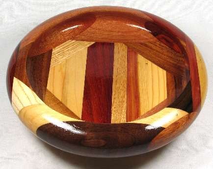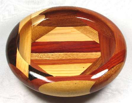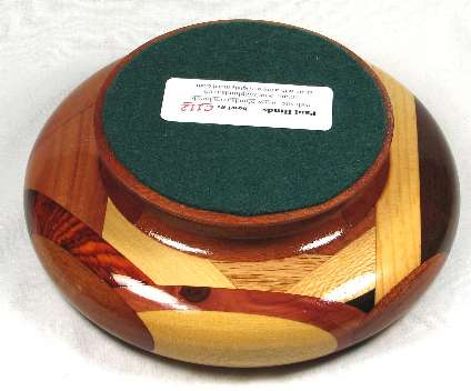 flaws/issues: the zircote in view 4 broke off at the edge during what was to be the final sanding and interestingly enough embedded itself in my finger without doing any significant damage, which was QUITE surprizing both because it happened and because it didn't do much damage. The bowl was turning at high speed, as I always do for the final sanding, and it amazes me that all the chip did was prick my skin. Anyway, it was apparent that further turning would remove the immediate flaw but quite possibly just cause another one just like it as the zircote got thiner so I left it alone and sanded it and the cedar next to it to avoid sharp edges. It's pretty minor, but it is quite obvious both to the eye and to the finger, so I've reduced the price of the bowl from what it would otherwise be.