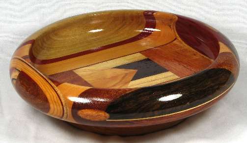 comments: I think the tiny oval of mahogany in view 2 would have been better off on the shop floor as a shaving, but I must not have thought so when it was on the lathe. Note how all three large pieces of mahogany are significantly different from each other. I don't generally keep track of mahogany subspecies, but I believe that the view 5 piece is African, the view 1 piece is Honduran, and I'm not sure about the view 3 piece; probably one of the many African species since it looks somewhat like sapele. The sycamore pieces in this bowl are very NON-flaky --- so much so that they almost don't look like sycamore, but I think they were a good choice for the contrasts in this bowl.