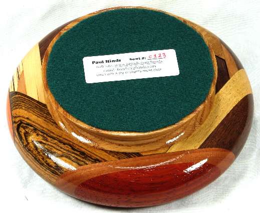 flaws/issues: The last piece of ash in view 3 has a small surface dent. This happened on the lathe and I didn't want to turn the whole bowl down far enough to get rid of it because doing so would have required ruining the black ash / wenge oval in view 4 and I wanted to keep that.