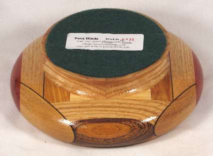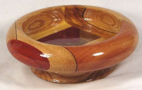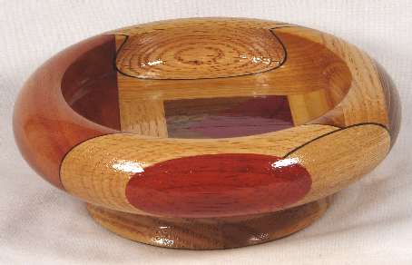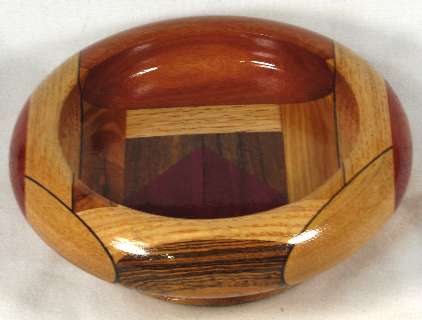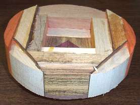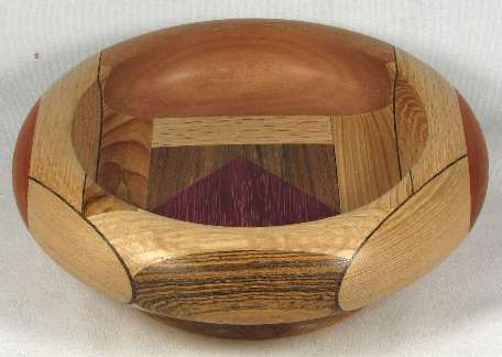 The padauk pieces in views 3 and 7 have darkened to a deep blood red and the purpleheart in the BOX has darkened some as well. The machiche in view 5 has darkened slightly. Despite the minor stress separations and the color changes it is outstanding because of the omega curves inside the rim and the ovals on the outside of the rim most of which are are very nicely delineated by ebony veneer