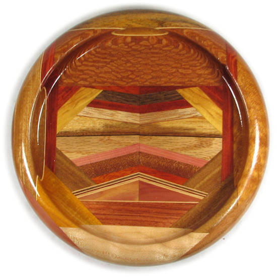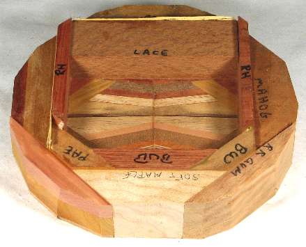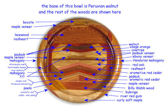 COMMENTS: The curly maple at the bottom looks better in reality than it does in the pics. There are several omega curves inside the rim. Aside from the unfortunate edge tearout, the lacewood at the top is very nice and there are a number of other excellent woods in this bowl. The flawed bocote at the top has ray flakes, which is the reason it was used in the rim.