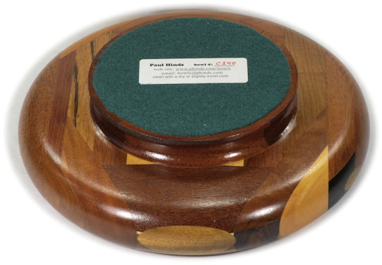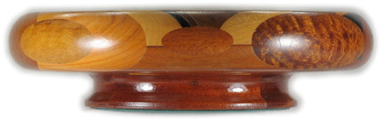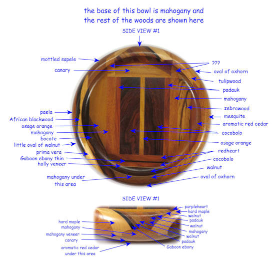 I ALWAYS POINT OUT ANYTHING THAT NEEDS TO BE COMMENTED ON. THESE ARE (UNLESS OTHERWISE STATED) THINGS THAT DO NOT DETRACT FROM THE BEAUTY OF THE BOWL, BUT I WANT TO BE SURE I GIVE A COMPLETE DESCRIPTION. SO ... The osage orange on the left of middle has some burn marks inside the rim where the end grain was turned. I could have turned it down further and removed these but there was too much danger of getting chip-out in the lamination at the top so I decided to just leave the burn marks in as they are (actually, they were worse, but sanding got rid of a lot of it). The left piece of cocobolo in the middle has developed a noticeable crack about 3/4" long. Several of the woods, including the cocobolo in the middle and the osage orange on the left, have darkened since the bowl was first finished many years ago (they are as you see them in these pics, which are quite recent).