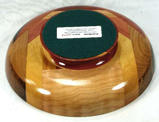 The outer edge of the flat rim is about as sharp as I allow edges to be on my bowls; it has just a slight bevel. The reason for my dislike of sharp edges is twofold: first, they dent easily and thus make the bowls more fragile than I am comfortable with and second, when the bowl is on the lathe, sharp edges can cut my fingers and in fact that did happen (rather trivially) with this bowl before I beveled that edge in the final on-lathe sanding.