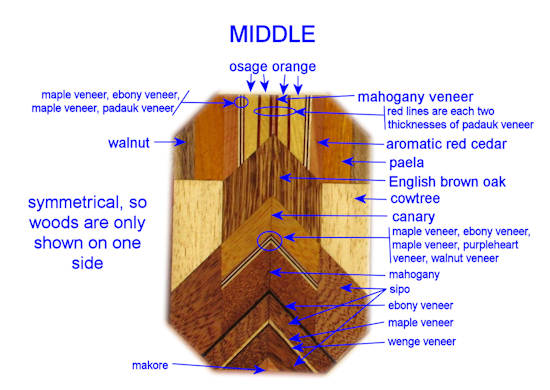comments: A particularly nice light-color-woods middle section with some very attractive contrast-wood laminations. A bit "busy" but I think it works well.