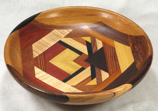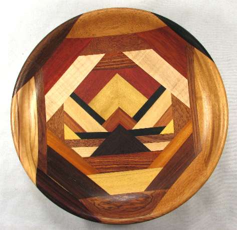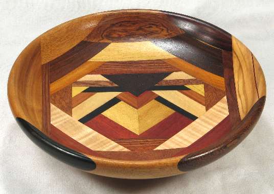 BOX: wedges up the middle are wenge, bloodwood, machiche, yellowheart, purpleheart. Up the sides are maple, sapele, Gaboon ebony, osage orange, machiche, basswood(?), Gaboon ebony