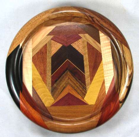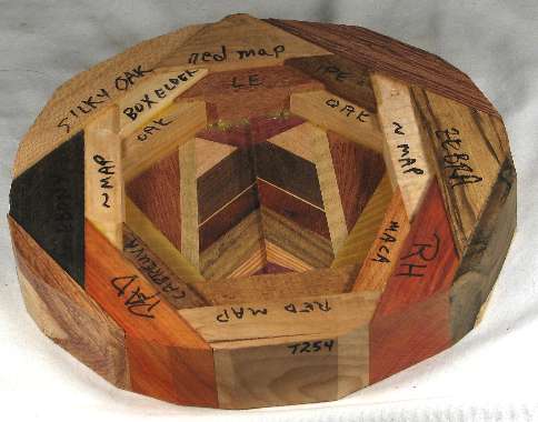 BOX: from the bottom up the middle are dual pices of purpleheart, Douglas fir, shedua, red narra, thick birch veneer, panga panga, silky oak, purpleheart. The vertical piece outside the middle are oxhorn and the yellow pieces outside that are osage orange and the wood above the osage orange is Honduras rosewood.
