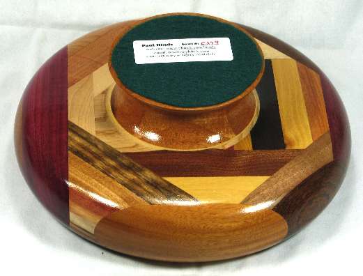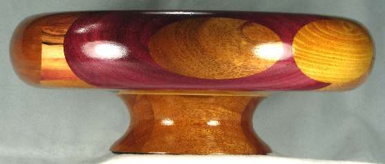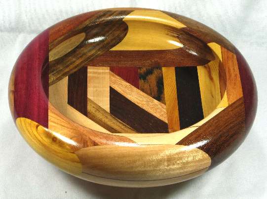 comments: This is a hefty one, and I suggest you avoid dropping it on your toe. The purpleheart in view 3 is really beautiful (compare its color to that of the piece in view 7). The canary in view 1 is nicely chatoyant, as are the two pices of birch at the outside of view 5, and the osage orange in view 4. The panga panga in views 6 and 8 both present wonderful grain patterns, as I knew they would when I selected them for the rim of this bowl.