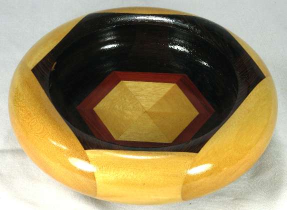 flaws/issues: the wenge inside the rim in view 4 developed an obvous chip-out. Experience told me that attempting to turn down below the chip-out was not likely to improve the situation because that piece would most likely have continued to chip out along the same edge, so I softened the edges but couldn't do much about how bad it looks. You can see it in a closeup pic down below. Too bad, to, because otherwise this bowl is really beautiful. I've reduced the price quite a bit because of the chip-out.
