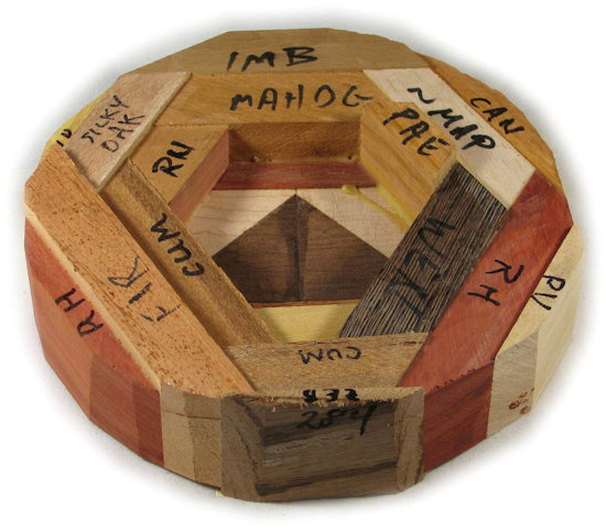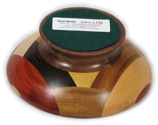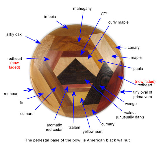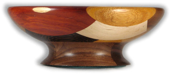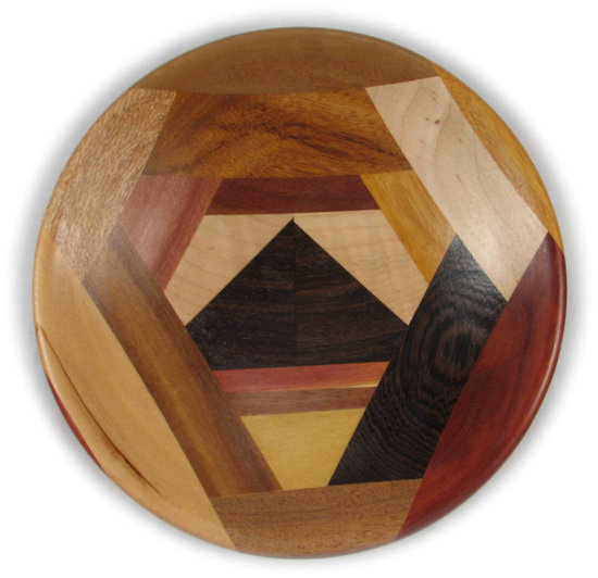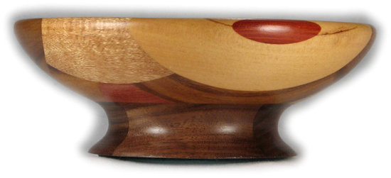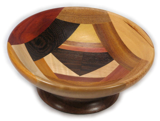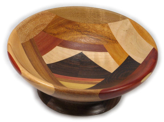 COMMENTS: Nice "wok" shape on this one but it's small and rather bland so I've priced it low. The wenge in the lower right has a nice grain pattern but unfortunately it doesn't balance well geometrically with the dark walnut triangle in the middle (when I built the blank it did not look as though the walnut was going to show up so dark)