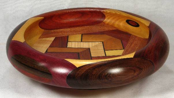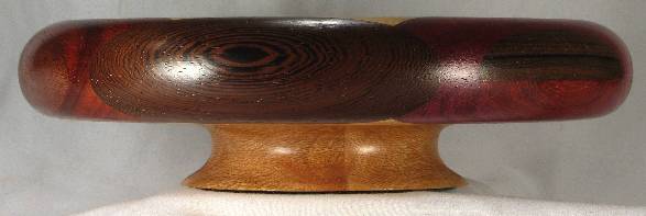 comments: symmetrical through a line up the middle, I think this is one of my better efforts. The composition of wood choices strikes me as particularly pleasing and the quality of the pieces is excellent throughout. Very nice omega curves inside the rim, and the little ebony oval inside view 5 is a particularly nice touch. I was going to turn the rim down just a little more but I so liked how that oval looked that I stopped at that point.