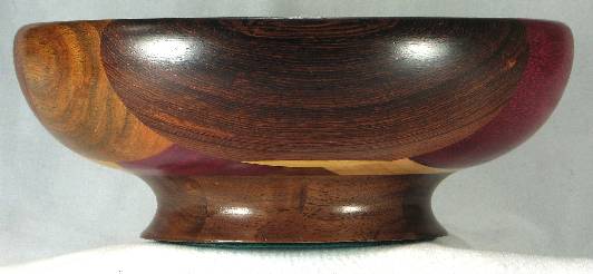 flaws/issues: The purpleheart in view 2 has a crack which you can't even see unless you really look for it. When I first saw this as I was turning the bowl, I thought I had slipped the gouge and scratched the wood, but it soon became apparent that it's a crack in the wood. Fortunately, it doesn't go through to the surface on the outside of the bowl.