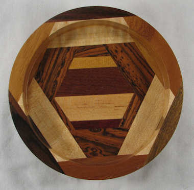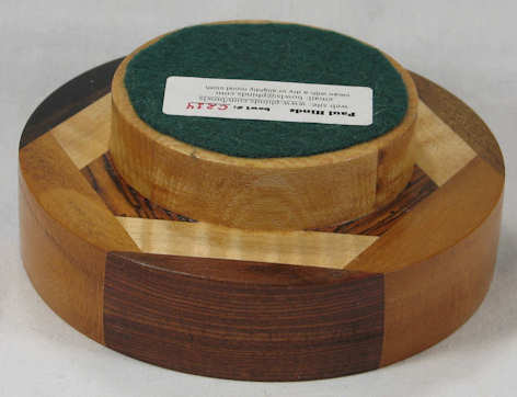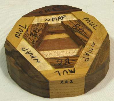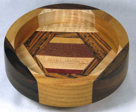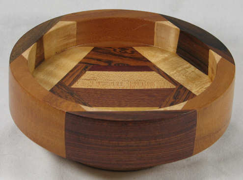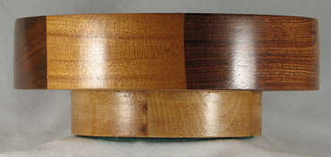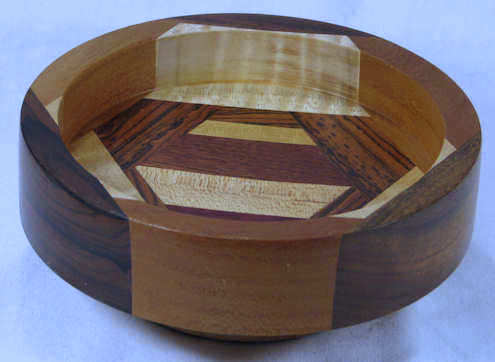view 1c when the bowl was first finished and then after it had been exposed for over a year; note that the mulberry in particular, and to a lessor degree the bocote, have darkened.
