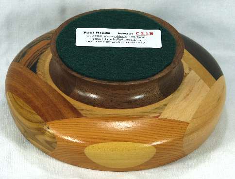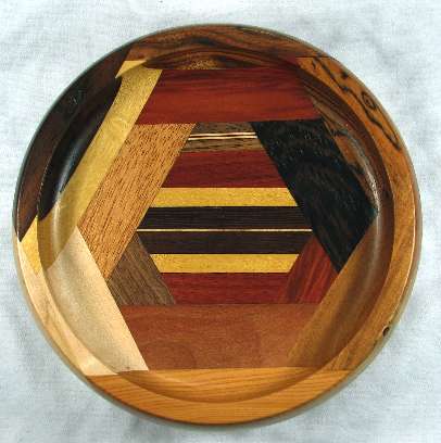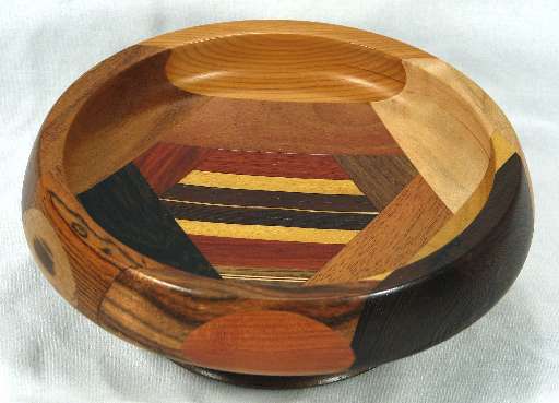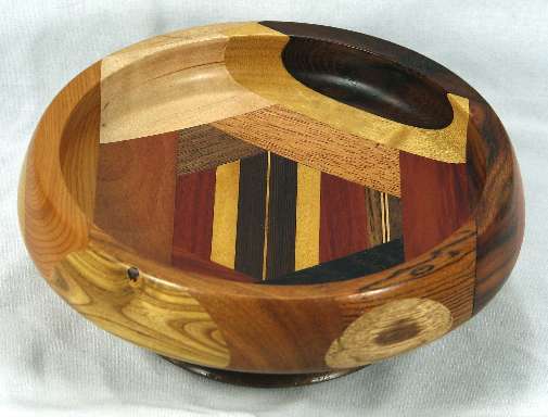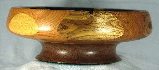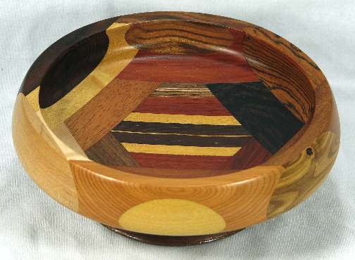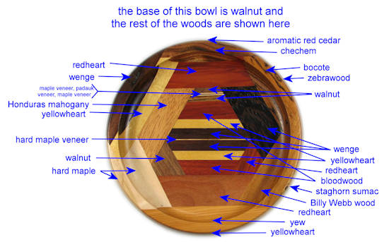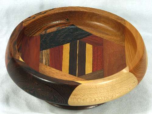 comments: The wenge in the upper left was chosen for its irregular grain and it turned out extremely well; wish I had a lot more of that. The yew at the bottom seems particularly nice to me. There are some nice omega curves inside the rim.