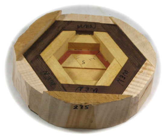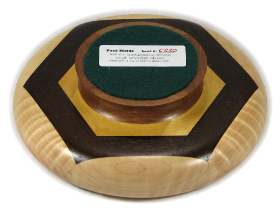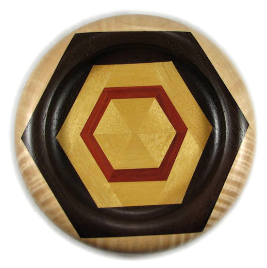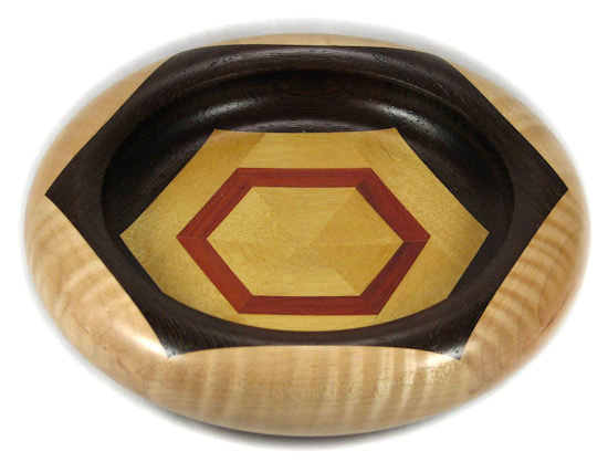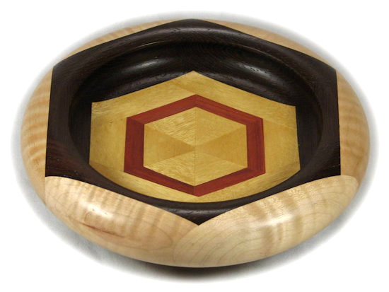 I ALWAYS POINT OUT ANYTHING THAT NEEDS TO BE COMMENTED ON. THESE ARE (UNLESS OTHERWISE STATED) THINGS THAT DO NOT DETRACT FROM THE BEAUTY OF THE BOWL, BUT I WANT TO BE SURE I GIVE A COMPLETE DESCRIPTION. SO ... The hexagon of redheart in the middle has faded slightly to a brownish red. Two noticeable separations have developed in the middle, one of which is the horizontal line across the middle (not a bad one) and the other runs at a slant along the inside of the yellowheart in the lower left. This one is more noticeable and as a consequent, I have reduced the price from $125 to $95 even though the visual impact of the flaws is minor and the bowl is a real beauty.